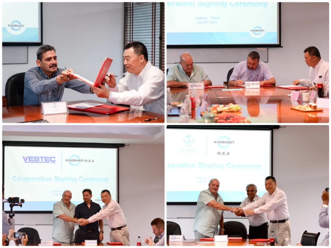 在開山控股集團有限公司董事長曹克堅先生的見證下,Kaishan MEA CEO Mr.John Byrne分別與沙特阿拉伯Kanoo公司、阿聯(lián)酋/巴林Kanoo公司、挪威Vestec公司、愛爾蘭LMF-GBI簽署了戰(zhàn)略合作儀式。