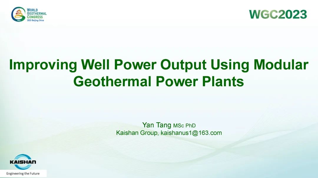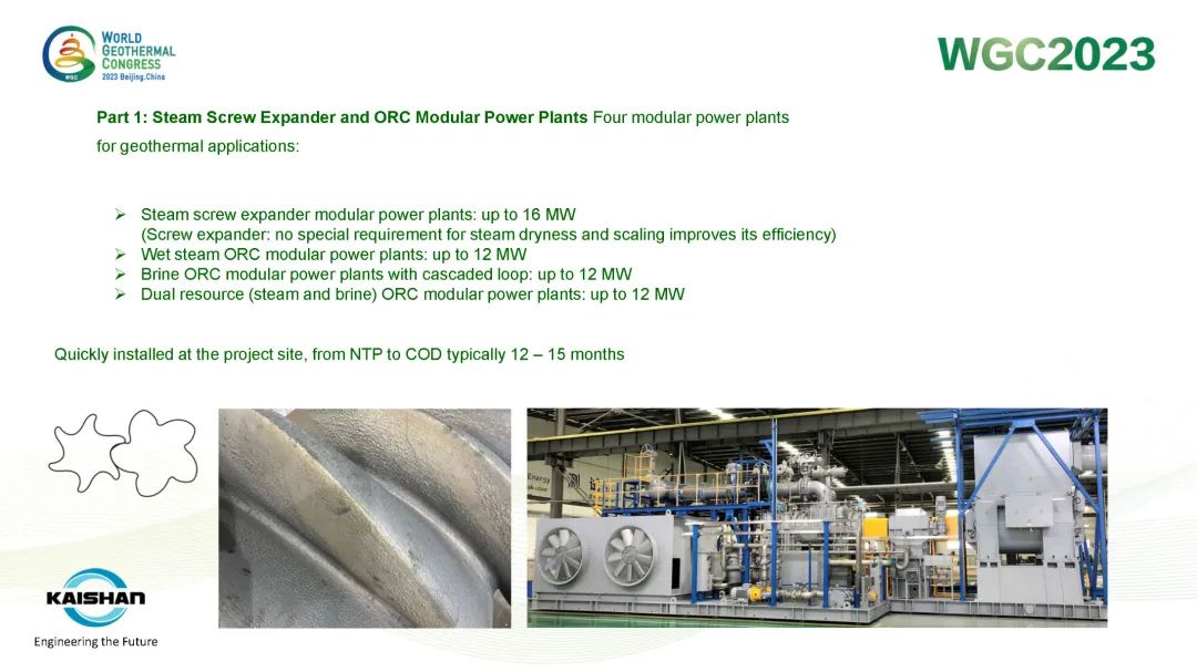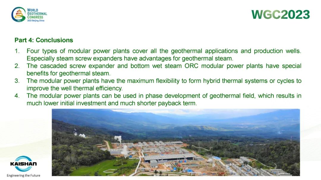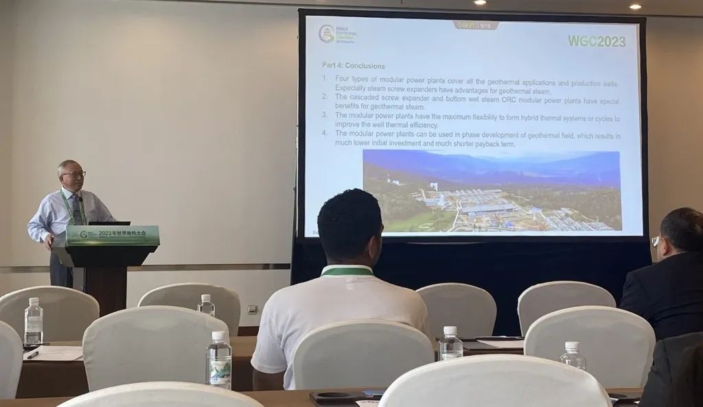 9月16日,公司總經(jīng)理、開山地?zé)峋谀K發(fā)電技術(shù)創(chuàng)始人湯炎博士參加2023年北京世界地?zé)岽髸?huì)(WGC),并受國(guó)際地?zé)釁f(xié)會(huì)(IGA)首席執(zhí)行官M(fèi)arit Brommer女士邀請(qǐng),做了題為《使用地?zé)崮K電站提高地?zé)峋a(chǎn)量》(Improving Well Power Output Using Modular Geothermal Power Plants)的專題報(bào)告。