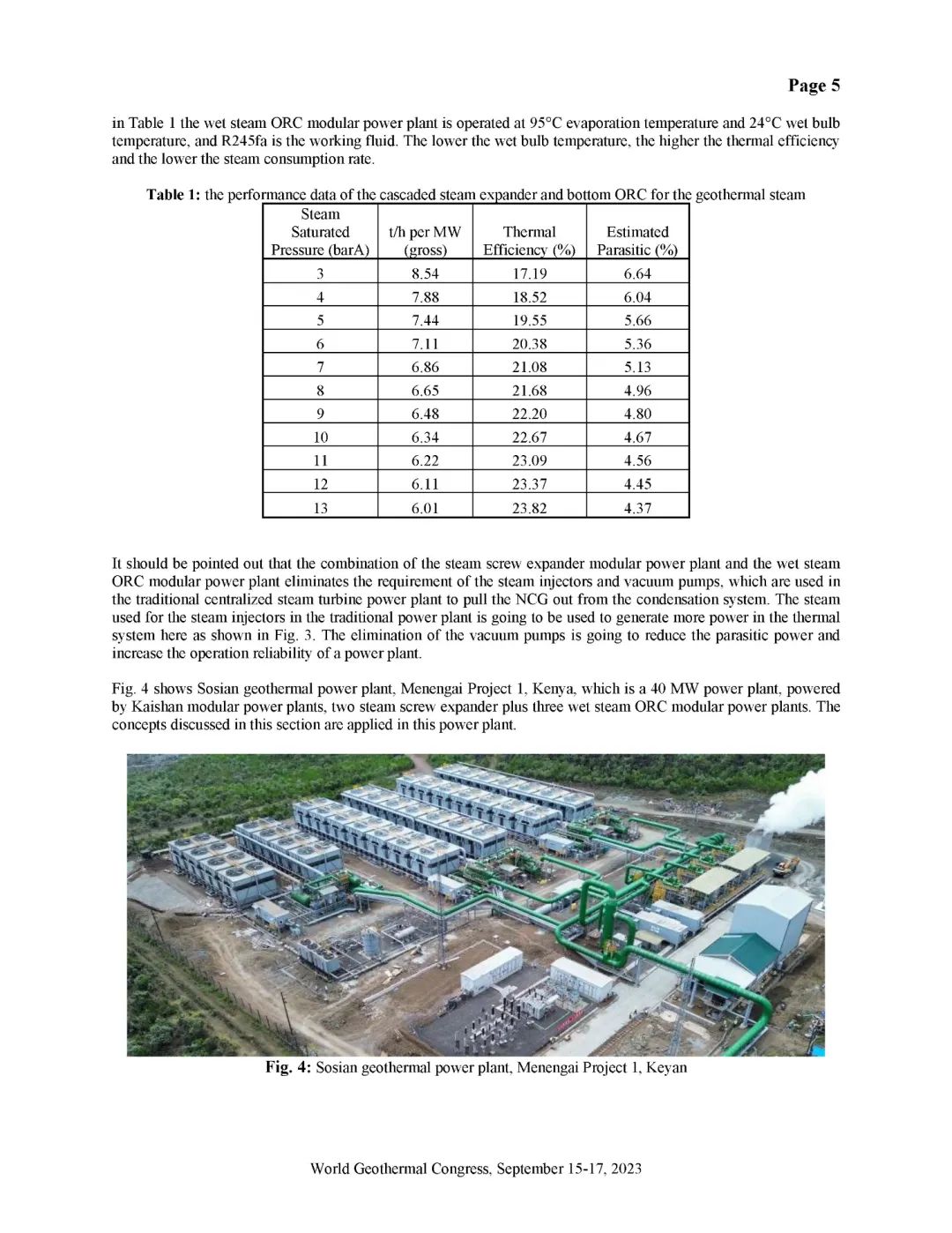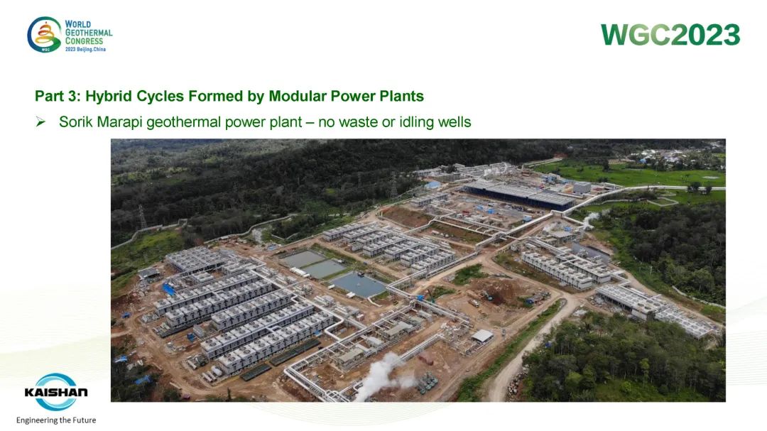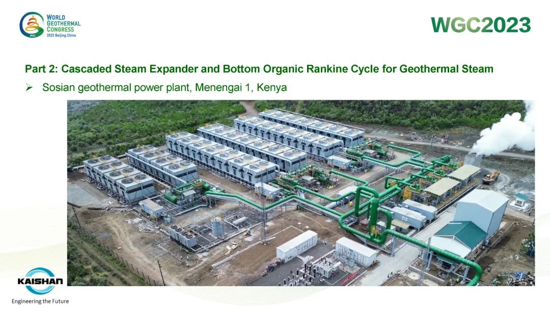 湯炎博士著重介紹了由開山EPC建設(shè)的肯尼亞Sosian-Menengai地?zé)犭娬炯伴_山自主開發(fā)、建設(shè)、運(yùn)營(yíng)的Sorik Marapi地?zé)犭娬境晒Π咐osian-Menengai地?zé)犭娬静捎谩罢羝蛎洐C(jī)+濕蒸汽ORC膨脹機(jī)”模塊電站串級(jí)循環(huán),無(wú)需采用傳統(tǒng)中央電站分離不凝性氣體的蒸汽噴射器和真空泵,從而降低了電站寄生負(fù)荷、提高其發(fā)電效率。Sorik Marapi項(xiàng)目是公司各類型模塊電站的集大成者,高壓蒸汽井、低壓蒸汽井、熱水井熱源均可得到充分利用,進(jìn)而使項(xiàng)目實(shí)現(xiàn)“無(wú)閑置低壓/低溫井”。模塊電站“量體裁衣”式的解決方案通過(guò)提高井熱效率改善了地?zé)衢_發(fā)的經(jīng)濟(jì)性,也通過(guò)獨(dú)樹一幟地有效利用低壓地?zé)峋盁崴@著降低了資源鉆探的單位成本。